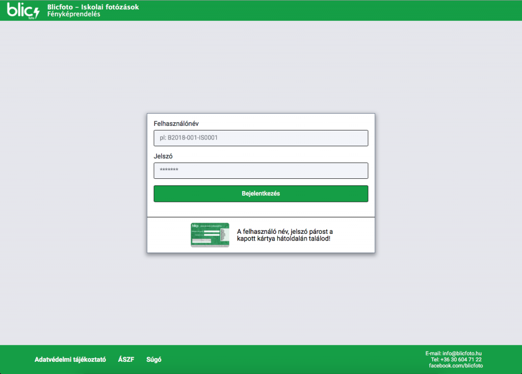 A saját képeid megtekintéséhez a kapott kártya hátoldalán található adatokat kell megadni a helyes mezőkbe. A felhasználói név NAGYbetűkből és számokból áll. A jelszó kisbetűkből és számokból!