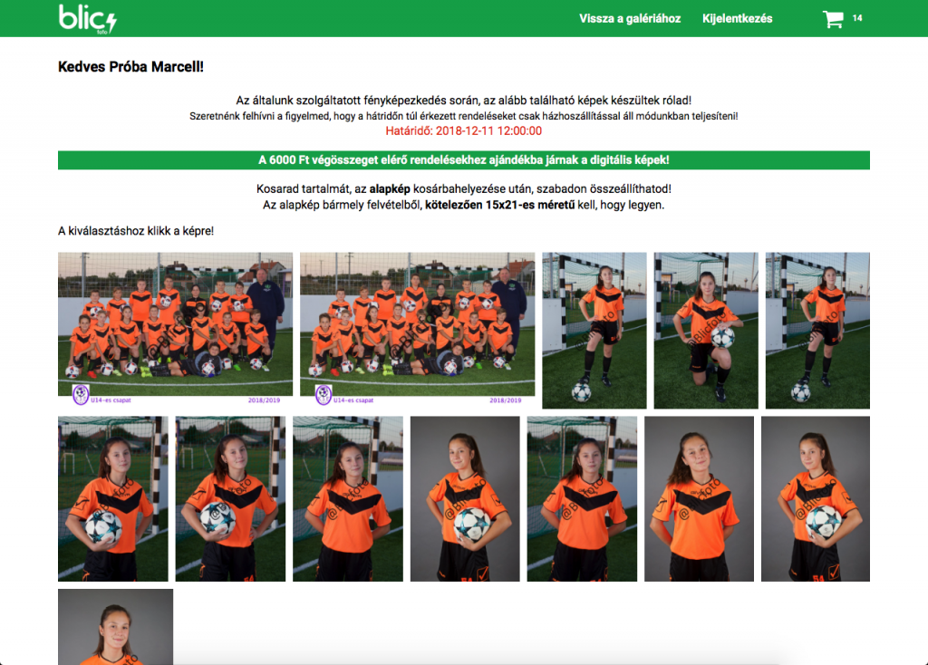 A bejelentkezést követően a galéria oldalra navigál a rendszer. Itt látható az összes kép, mely az bejelentkezett felhasználóhoz tartozik. A képek fölött a rendeléssel kapcsolatos általános információk találhatók. Egy adott képre kattintva lehet a képet kinagyítani, a képből rendelést rögzíteni.
