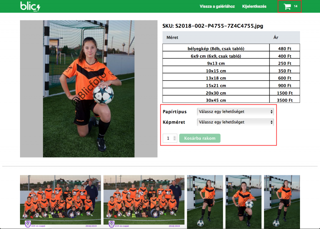 A képre kattintva a rendszer az adott kép oldalára (termékoldalra) navigál. Itt lehet a kiválasztott képből a megrendelni kívánt mennyiséget a kosárba helyezni. Itt a papírtípus, a mért és a darapbszám megadása után a zöld „Kosárba rakom“ gombbal a termék bekerül a megrendelni kívánt termékek közé (kosárba).