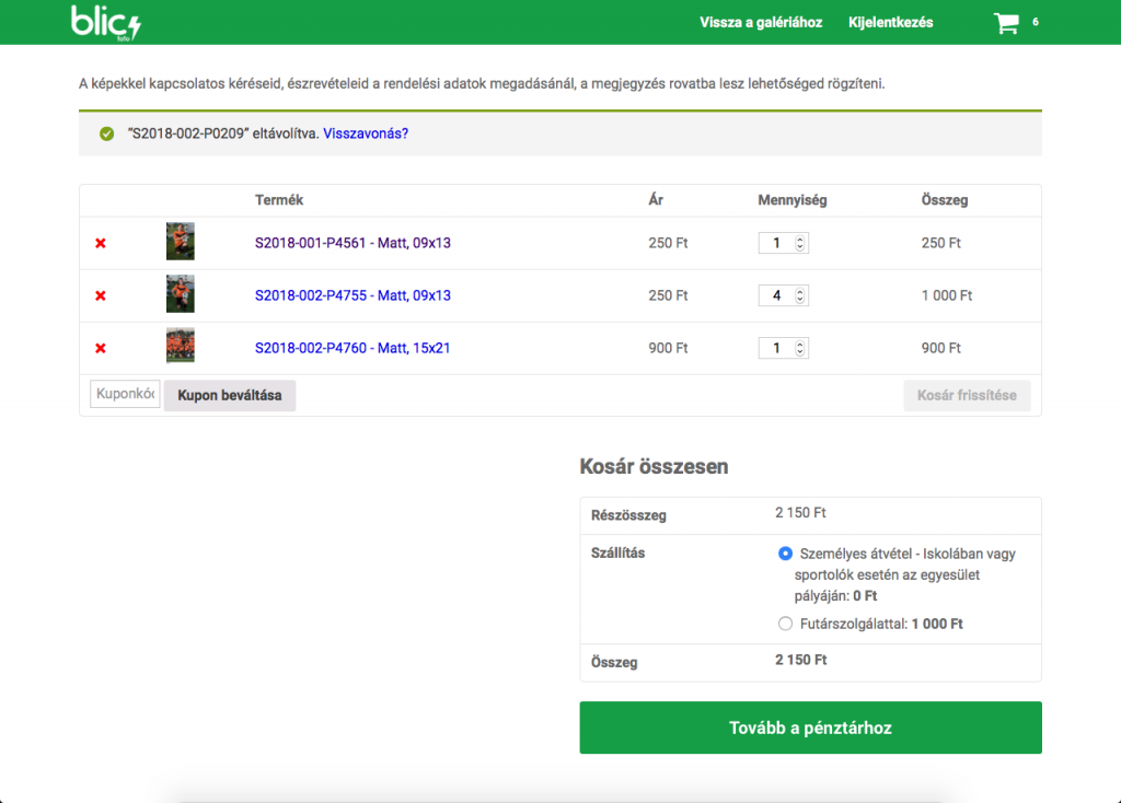 A képernyő jobb felső sarkában található kosár (bevásárló kocsi) gombra kattintva a rendszer elnavigál a kosár oldalra. Itt található a kosárba helyezett termékek tételes listája, a télelek végösszege, valamint a szállítási mód kiválasztása. A listából lehetőség van tételt törölni, valamint a megrendelni kívánt mennyiséget módosítani. A szállítási módoknál a személyes átvétel esetén, adott időpontban, az iskolába vagy sportolók esetén, a sportlétesítménybe kerülnek szállításra a képek, ahol lehetőség van a vételár készpénzben történő fizetésére. A rendelés véglegesítéséhez a „Tovább a pénztárhoz“ gombra kell kattintani.