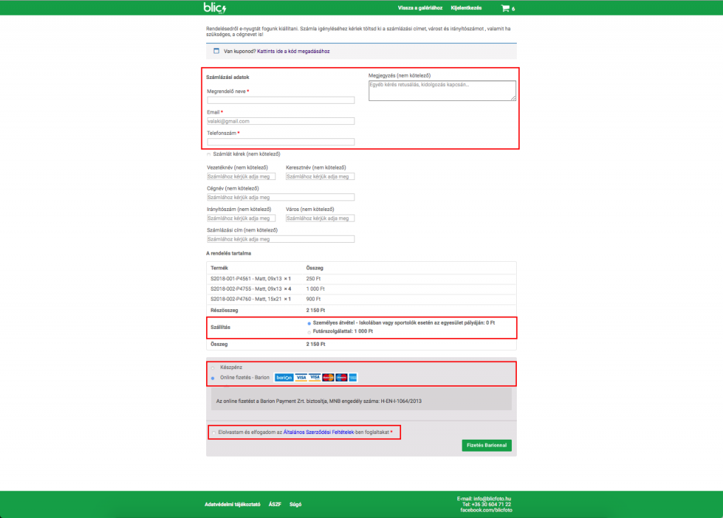 A pénztár oldalon bekéri a rendszer a rendeléshez szükséges adatokat. Az adatok megadása után van lehetőség szállítási, valamint fizetési módot választani. Személyes átvétel esetén, adott időpontban, az iskolába vagy sportolók esetén, a sportlétesítménybe kerülnek szállításra a képek, ahol lehetőség van a vételár készpénzben történő fizetésére. A rendelés elküldése előtt az ÁSZF, a pipa segítségével elfogadásra kell, hogy kerüljön. A rendelés rögzítéséhez a „Rendelés elküldése“ gombra kell kattintani. Ezt követően a rendszer kiírja a rendelés adatait, valamint a megadott e-mail címre kiküldi a rendelés visszaigazolásáról szóló e-mailt.